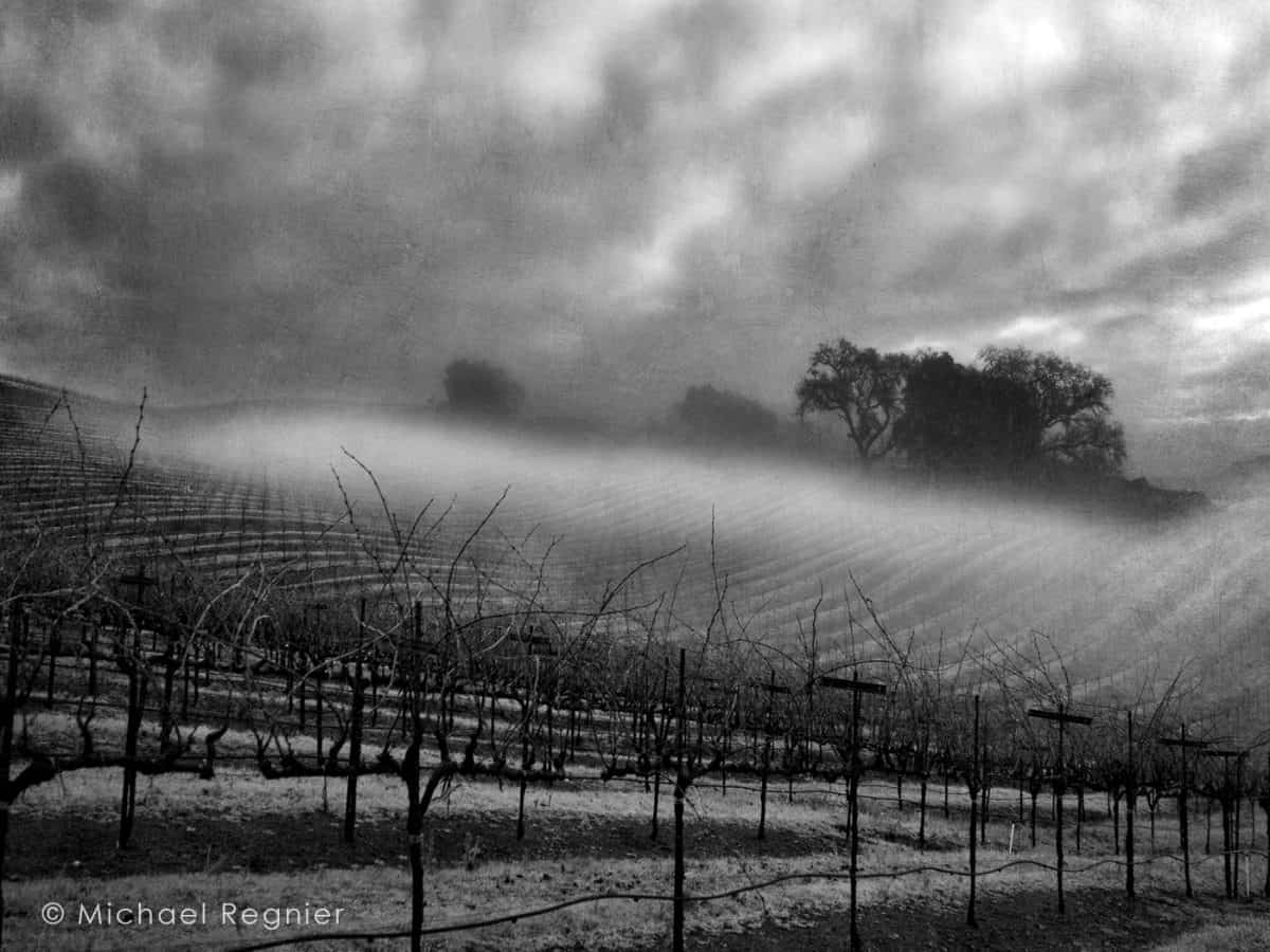 “Most of us don’t have the right combination of early-morning discipline and luck to experience the magic of fog in the vineyards the way that Michael has captured it here. There is something magical about the rows of vineyards (in this case, waiting for their winter pruning) emerging like silent ghosts out of the mist. At times like that, the world almost appears to be rendered only in shades of grey and silver.” — Alder Yarrow