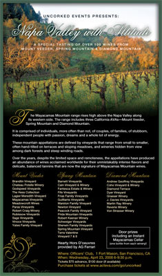 The Mayacamas Mountains, which separate Napa from its neighbor Sonoma to the west, are home to three main AVAs (American Viticultural Areas), and more than thirty different wineries. Spread among the Mount Veeder, Spring Mountain, and Diamond Mountain AVAs, these wineries have joined forces to market themselves jointly as wineries of the Mayacamas Mountains. And they are all coming to San Francisco to let you taste their wines.