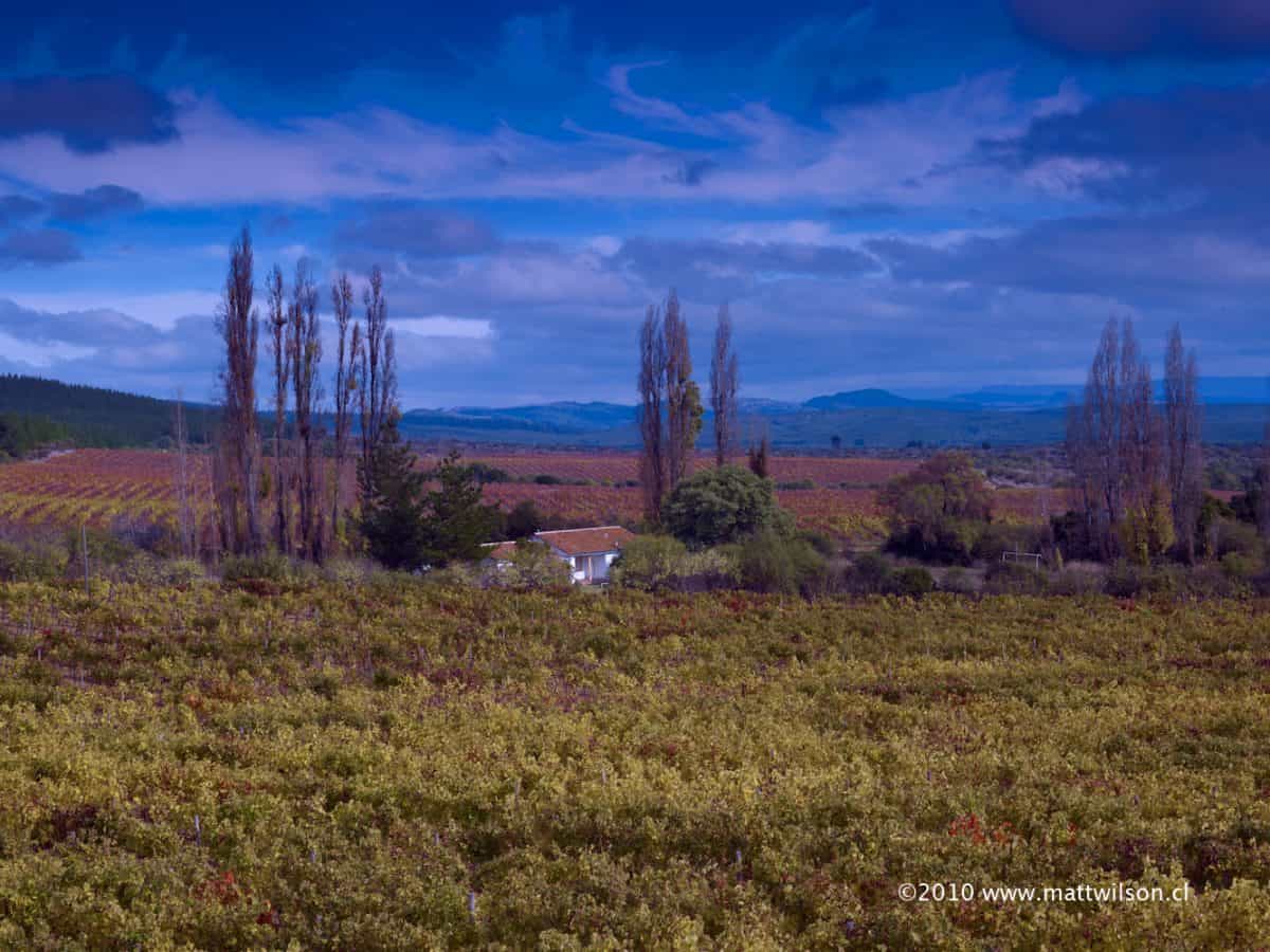 This is a photograph of the cottage where the winemaker for J. Bouchon winery lives in Chile’s Maule Valley. I never really imagine myself as a winemaker or winegrower (I’d much rather just drink the stuff, and I tend to kill plants) but if I were so inclined, I’d definitely want to live in the middle of my vineyards. It seems to me that if you are going to tie your livelihood to plants, and if you aspire to grow them to the peak of perfection, you should live with them for as much of your day as possible. Of course, it would help if your vineyards were in as beautiful a landscape as these. — Alder Yarrow