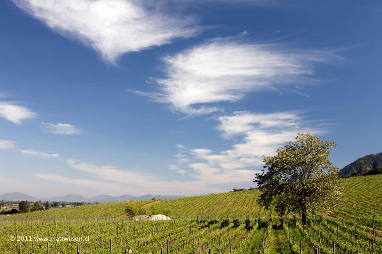 Sometimes I like to think of grapes as the permeable membrane that separates the earth from the sky. They take in the sunlight and the air and they channel the water and the soil into their leaves and fruit. Which makes wine a bit of bottled sunshine, and the chemical embodiment of a season’s weather. This photo shows the dramatic Chilean sky above the Colchagua valley. — Alder Yarrow