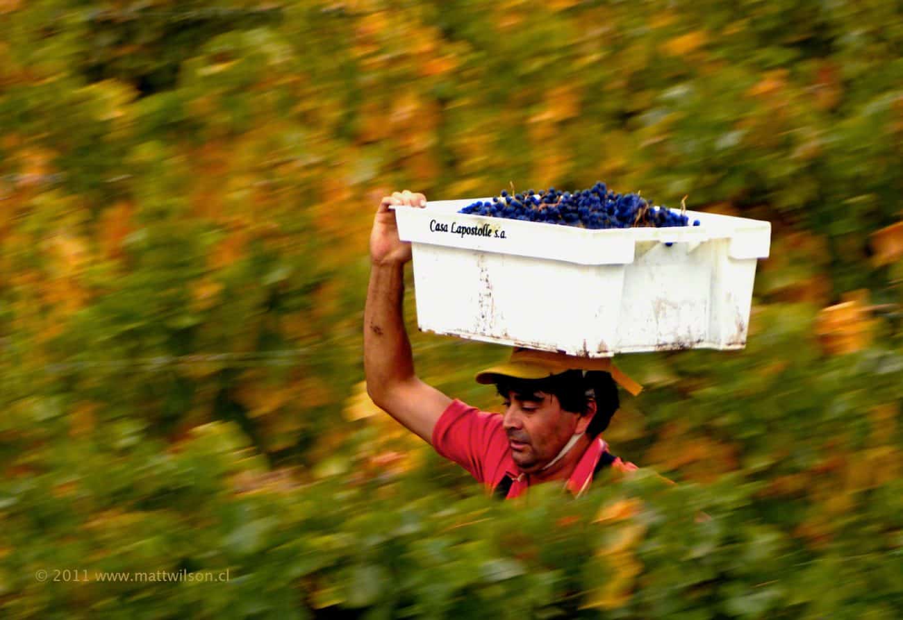 If you’ve never seen workers racing to get the harvest in, lugging 20 kilogram boxes of grapes at a rapid clip you’re missing something of the picture of all the hard work that goes into wine. Harvesting is back-breaking work, even when you’re not carrying the grapes on your head, like this worker at Casa Lapostolle’s Clos Apalta winery in Chile. — Alder Yarrow