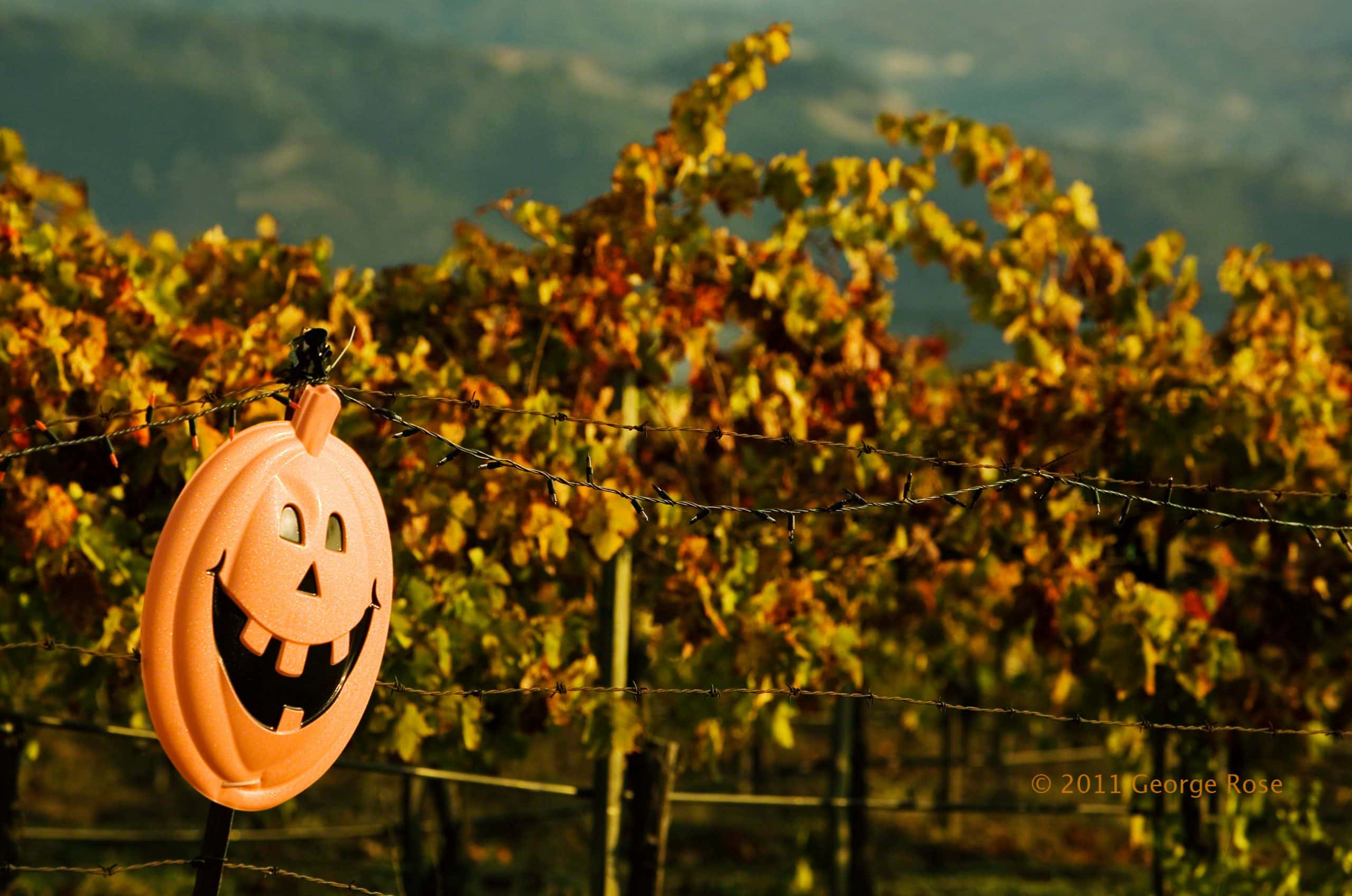 ALEXANDER VALLEY, SONOMA COUNTY, CA: As the grape harvest winds down, a plastic Halloween pumpkin hangs from a vineyard post and the vines behind it turn their Autumn colors.