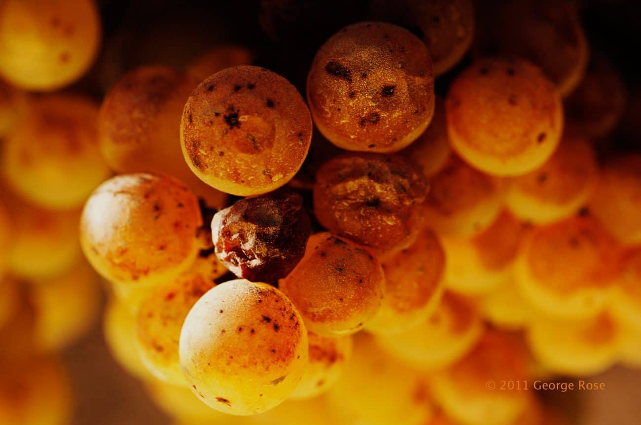 MONTEREY COUNTY, CA – 2006: A closeup of a bunch of Chardonnay grapes affected by botrytis is viewed in this 2006 Salinas Valley photo. Botrytis, also known as “the Noble Rot,” produces exquisite dessert wines including the famous Sauternes wines of Bordeaux. To those not shooting for unctuous sweet wines, however, Botrytis can be a problem, especially in wet years such as 2011. Indeed, California vintners are battling it even now, as harvest continues.