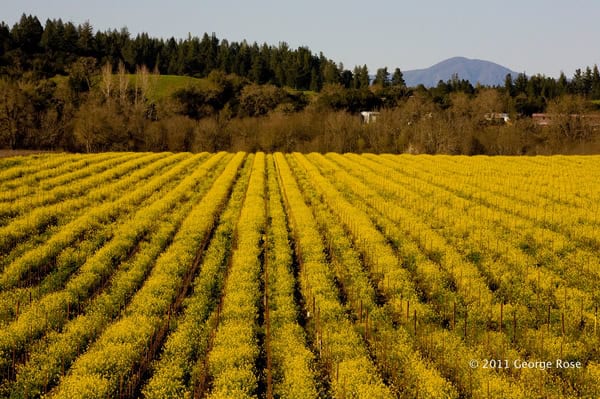 RUSSIAN RIVER VALLEY, CA: Flowering mustard growing between the grapevines signals the beginning of spring as seen in Healdsburg, Sonoma County, California.