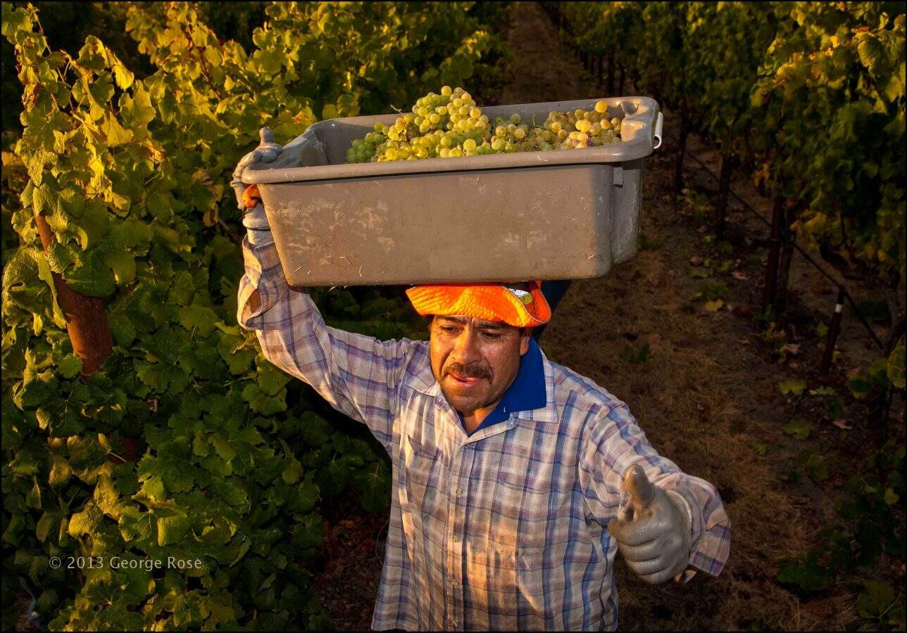 HEALDSBURG, CA: Vineyard workers picking semillon grapes in Knights Valley race to beat the fall rains near Healdsburg, California. With skies clearing and temperatures moderate after an early fall rain last weekend, the 2013 vintage is shaping up to be a stellar one.