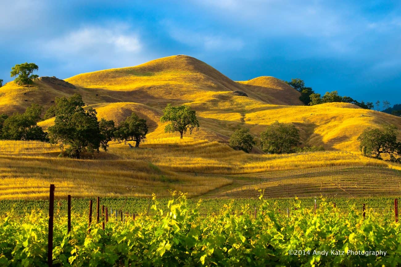 Evening sunlight turns the hills of Sonoma County wine country a bright gold in summer.