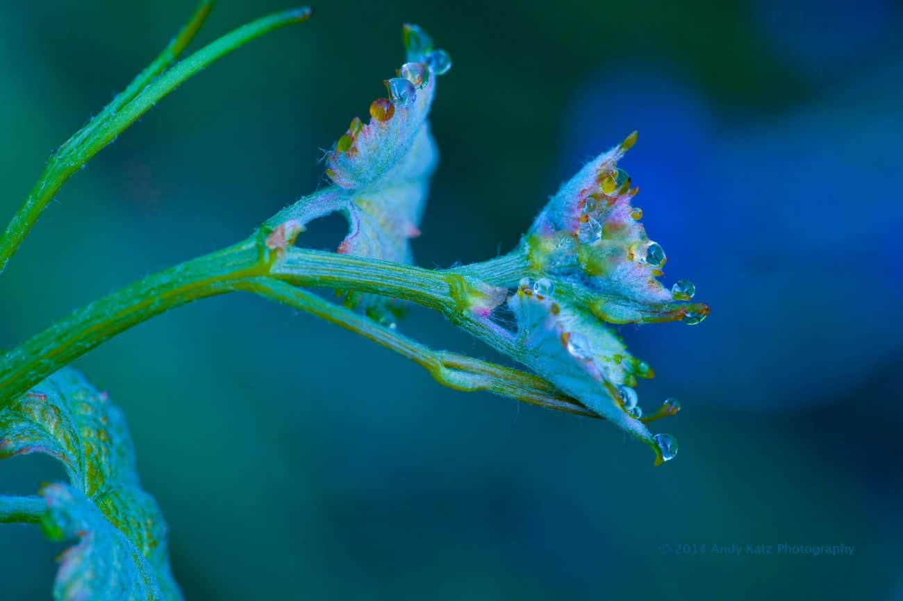 Dew beads on the down of a newly unfurled grape leaf in Sonoma County.