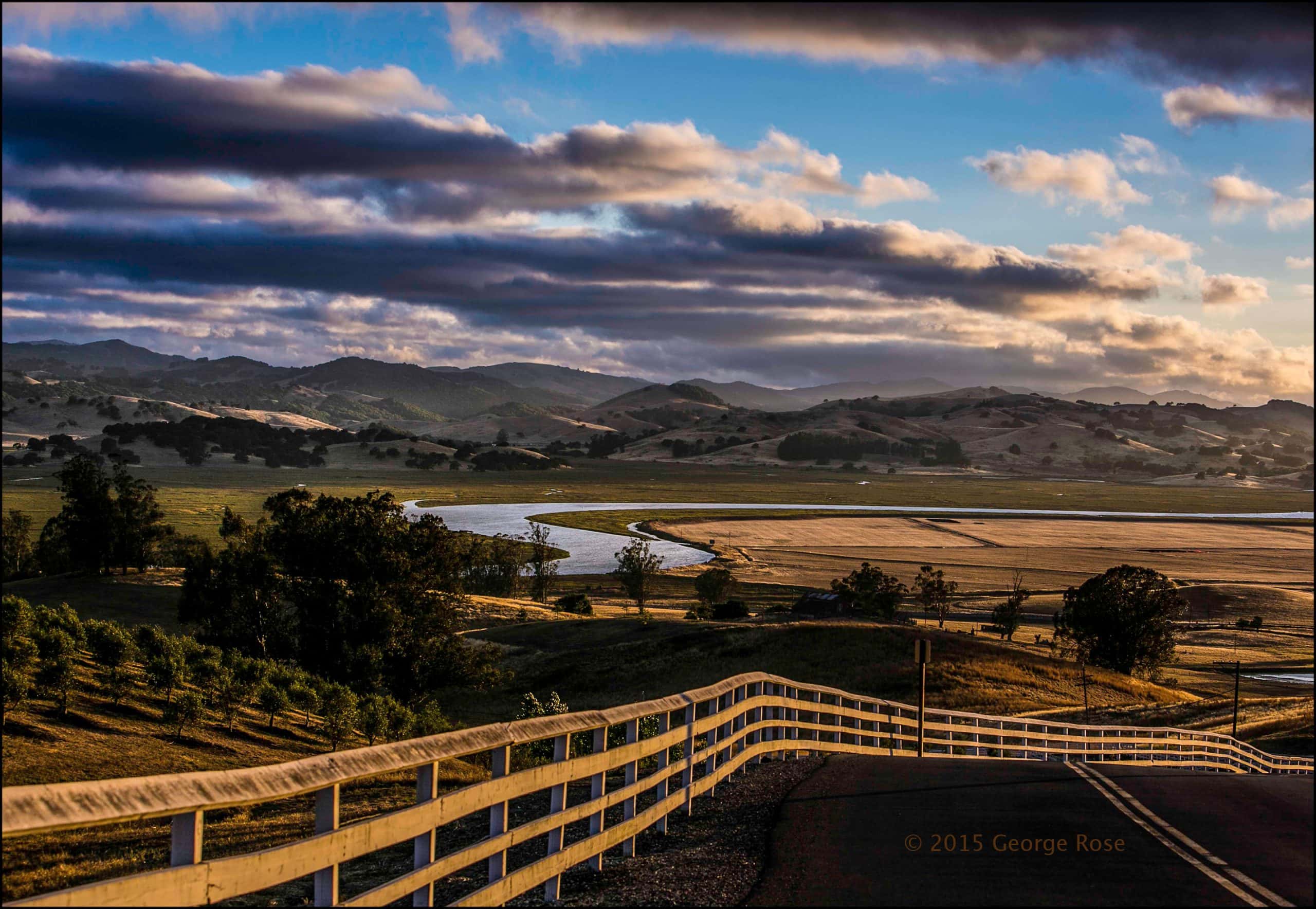 PETALUMA, CA: The hillsides and Petaluma River near Keller Estate Winery light up midst a summer sunset near Petaluma, California. Warm summer temperatures and a dry spring accelerated plant growth, resulting in vintners across the state expecting the earliest harvest in recorded history.