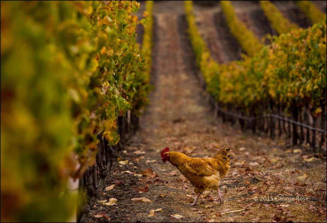 BUELLTON, CA: Chickens are let loose in the vineyard as a natural pest control mechanism at Ampelos Cellars in the Santa Rita Hills Buellton, California. Because of its close proximity to Southern California and the population of Los Angeles, the Santa Ynez Valley has become a popular weekend getaway destination for many tourists.