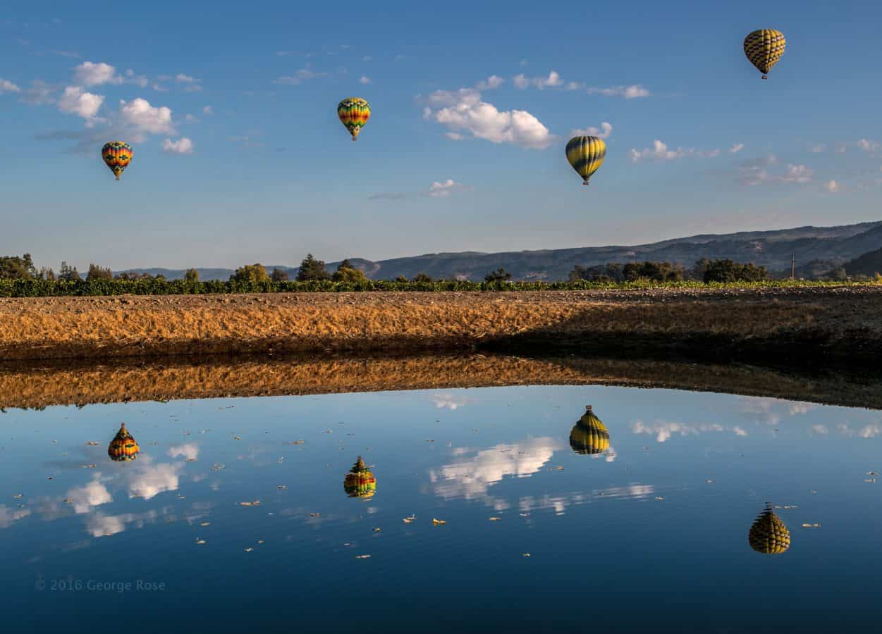 YOUNTVILLE, CA: A group of hot air balloons float above the Napa Valley near Yountville, California. Nearly 4 million domestic and international travelers visit Napa Valley each year, generating jobs in the arts, entertainment, recreation, food service, and lodging sectors.
