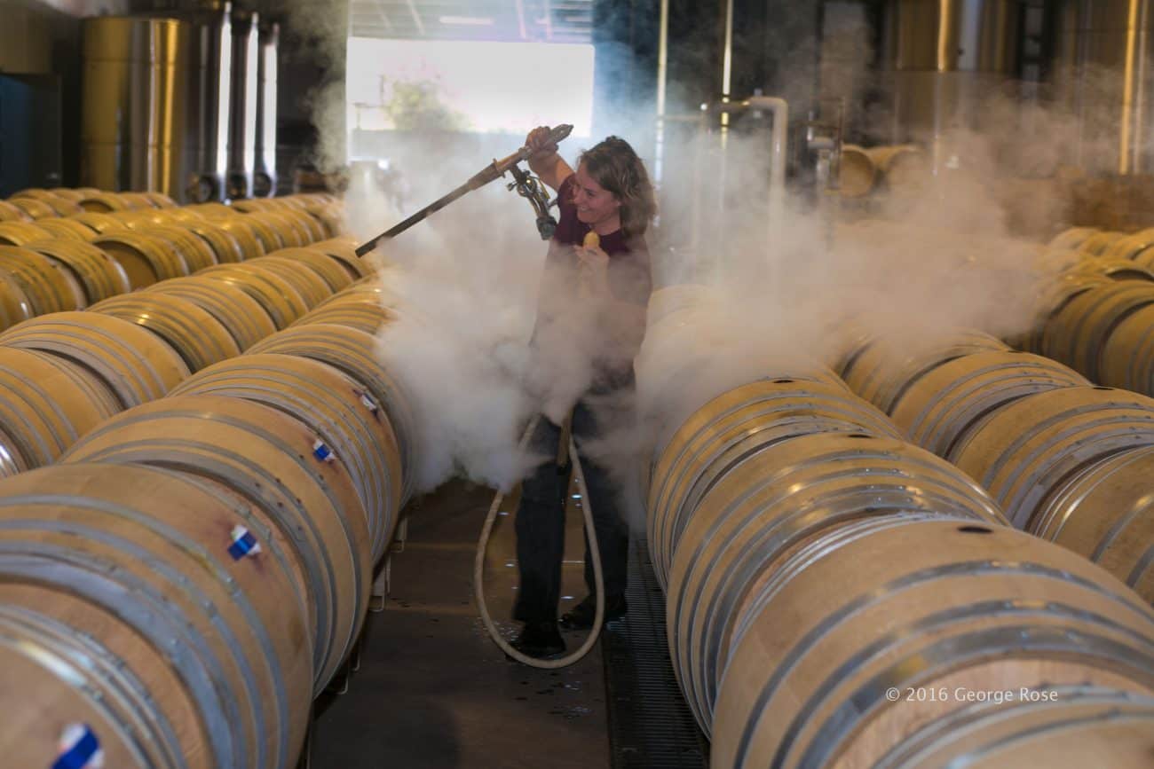 SEBASTOPOL, CA: A cellar worker at Kosta Browne Winery uses high heat steam to sterilize wooden oak barrels in Sebastopol, California. Barrel sterlization is an important part of clean winemaking for many producers.