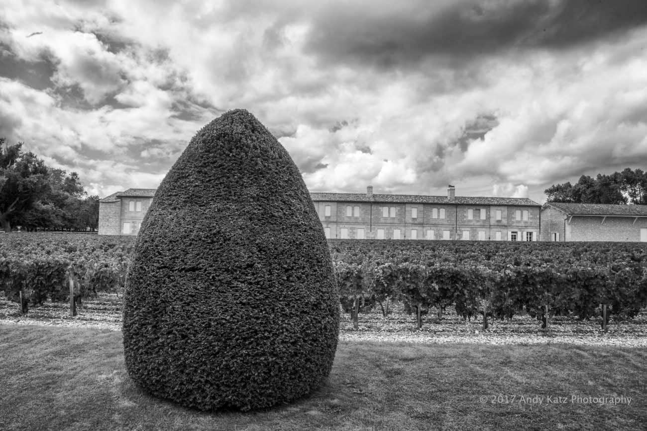 PAUILLAC, FRANCE: A topiary assumes monolithic proportions in front of rows of vines at Château Lafite Rothschild, which has been owned by the Rothschild family since the 19th Century. Lafite, as it is affectionately known, is one of four First Growths established by the 1855 Classification.