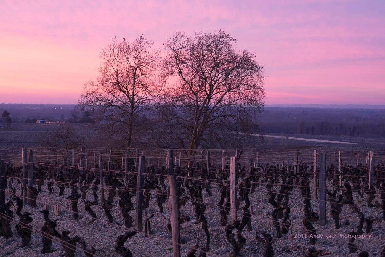 PAUILLAC, FRANCE: A cold winter dawn breaks to illuminates sleeping old vines and skeletal trees at Chateau Mouton Rothschild in Pauillac, a town in the Medoc region of Bordeaux. Mouton as it is affectionately known was not originally part of the First Growth designation in the 1855 Bordeaux Classification. Thanks to the advocacy efforts of its owner Baron Philippe de Rothschild, the estate managed something of a coup, and was elevated to First Growth in 1973, the only estate to have been so included in the modern era. Mouton is best known for its labels that have changed each vintage since 1945, and always feature the work of one of the world’s most famous artists.