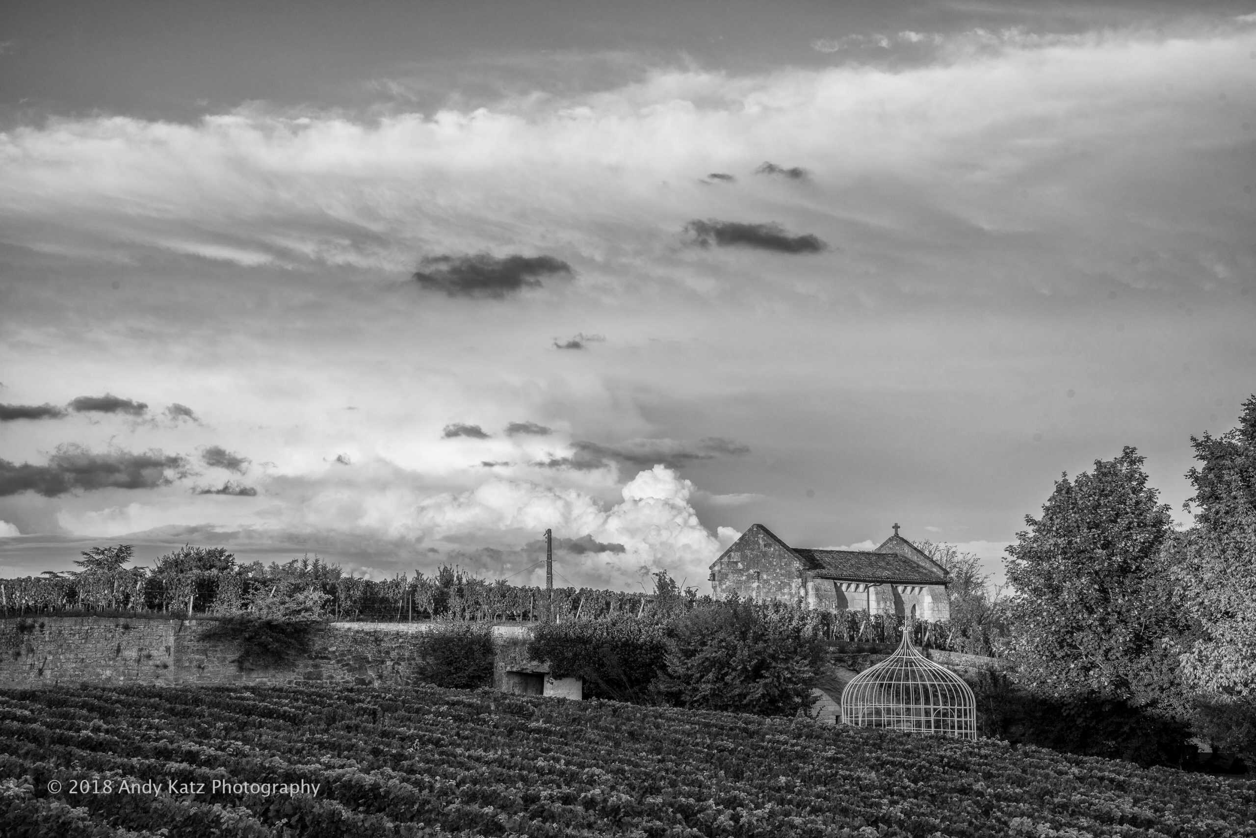 GIRONDE, FRANCE: Vines and old stone walls catch the evening light under chaotic skies above Chateau Ausone in Gironde on Bordeaux’s Right Bank near Saint-Émilion. Ausone is one of only 4 wines classified as Premier Grand Cru Classé in the Saint-Émilion classification.