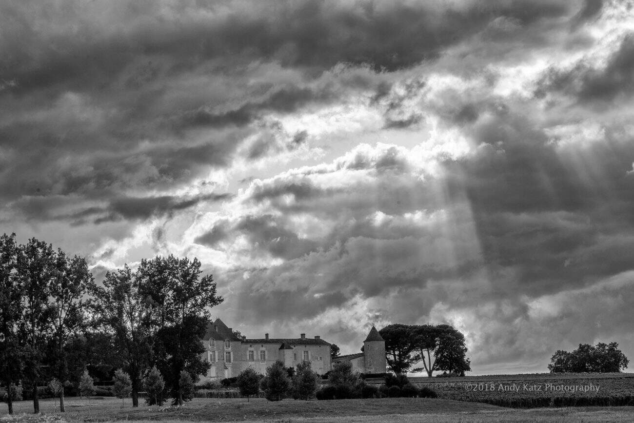 SAUTERNES, FRANCE: A break in the storm clouds lets evening sunlight fall on the vineyards and old estate walls of Château d’Yquem in Sauternes, an appellation within the Graves region of Bordeaux. In the famous 1855 Classification of Bordeaux, d’Yquem was the only winery in the Sauternes region to be accorded the status of Premiere Cru Supérieur. Its golden, sweet dessert wines are among the most famous, and long lived, in the world.