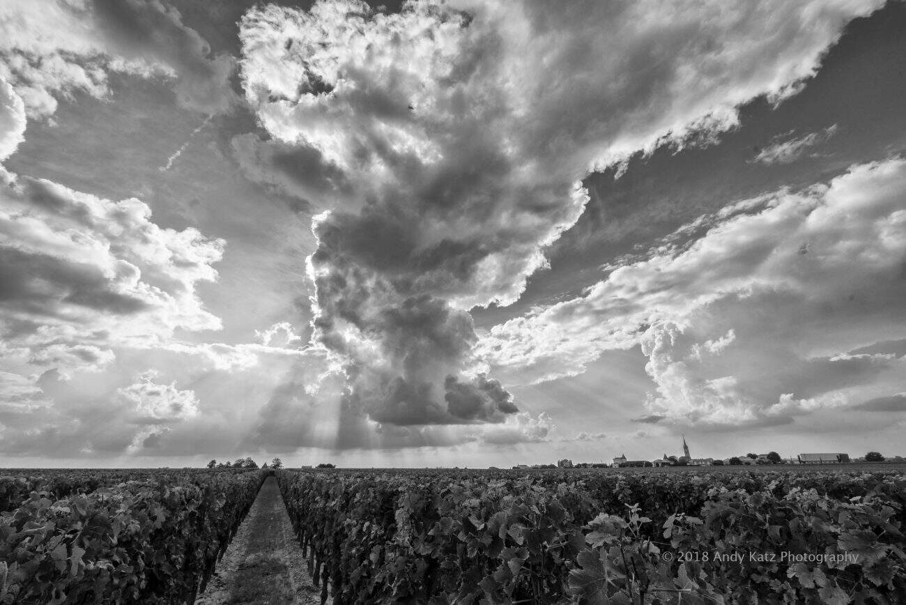 POMEROL, FRANCE: The sun dramatically highlights clouds after a rainstorm above one very long row of vines at Chateau Pétrus in Pomerol, on Bordeaux’s Right Bank. Pétrus became famous in the late 1800s after winning a gold medal at the Paris Universal Exhibition, beating out many more famous estates. One of the most expensive and sought-after wines in the world, Pétrus is widely regarded as the single best bottling of Merlot to be found, and remains the shining star of the Pomerol apellation, which has never been classified. Consequently it cannot truly be called a First Growth, though it clearly ranks among them in both price and quality.