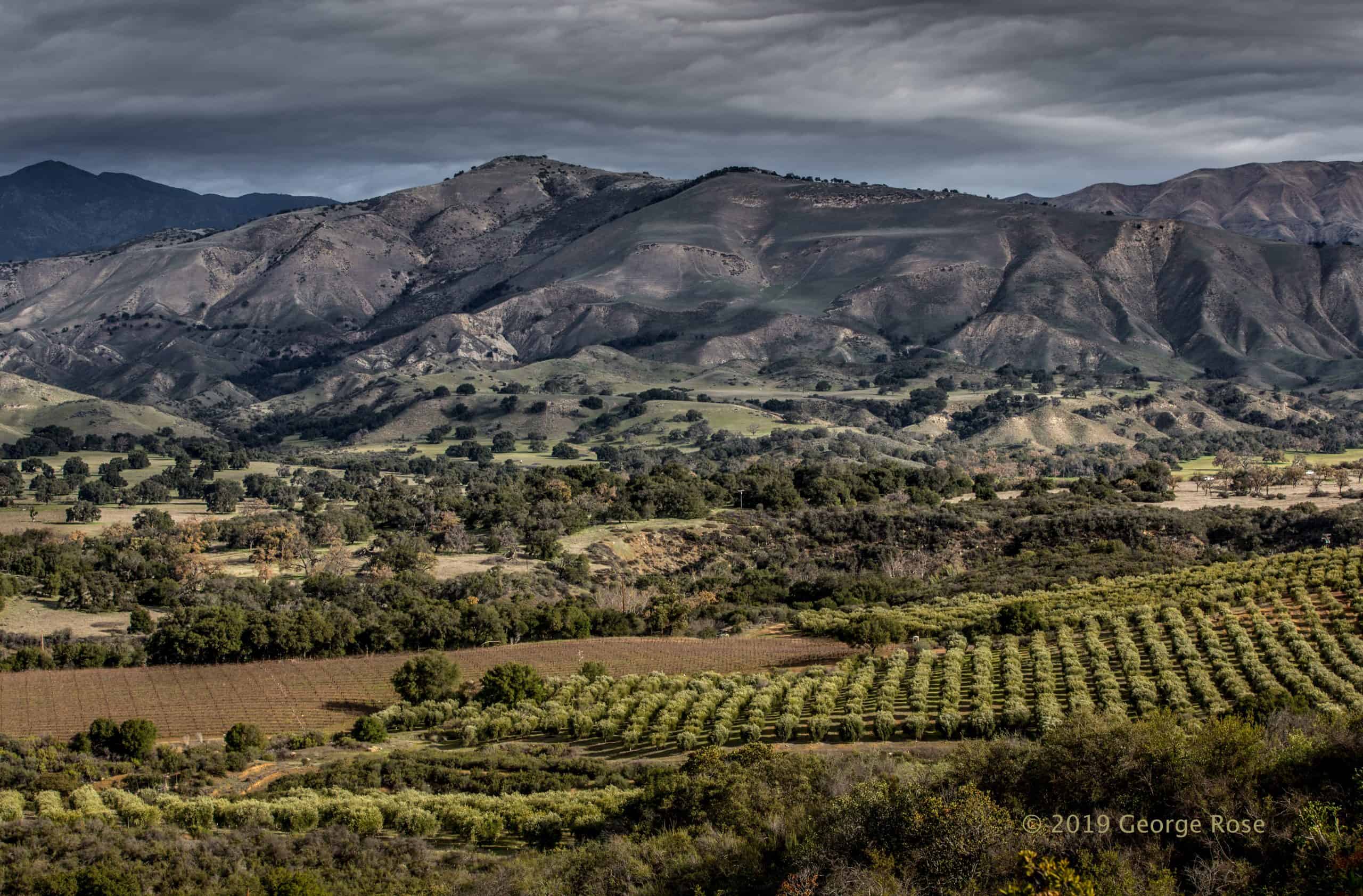 SANTA YNEZ, CA: The backcountry wilderness along Paradise Road along the upper Santa Ynez River can be seen behind vineyards and orchards near Santa Ynez, California. Santa Barbara’s interior wine country has grown to become one of California’s top tourist weekend destinations for those driving north from Los Angeles and Southern California.