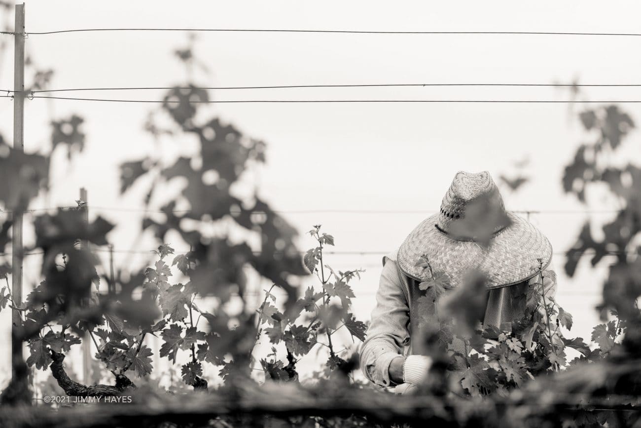A worker suckers vines in Napa’s famed To Kalon vineyard in the Oakville AVA. Suckering is the process of removing excess vine shoots from a grapevine to reduce its vigor and to shape the canopy in the most optimum way to properly ripen the grapes.