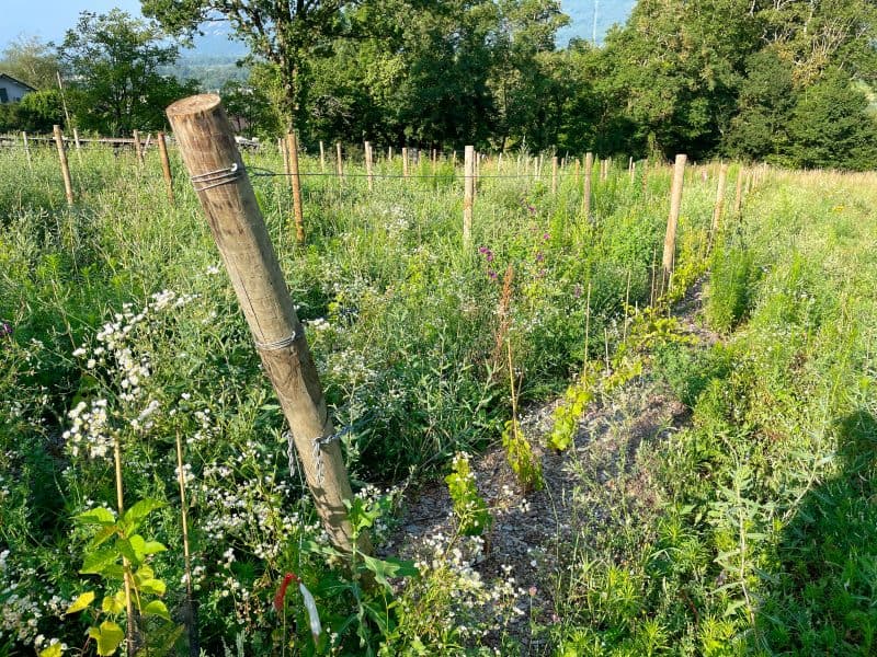 Curtet prunes during the winter, but other than that, he does no canopy management. Not content to have his vineyards merely surrounded by trees, Curtet has planted hundreds of trees in between the rows of his vines, around and among which he expects his vines to eventually climb and twine. In the meantime, he’s cobbled together branches in places to make what can only be described as arbors that he hopes the vines will climb. The vines are encouraged to sprawl, creep, and flop to the point that they can be difficult to distinguish from the chest-high mix of cover crops that populate the rows. He plans to keep the fruit in the 3- to 6-foot zone, while letting the vines wander where they will, fulfilling what he says is his obligation to let the plant express itself.