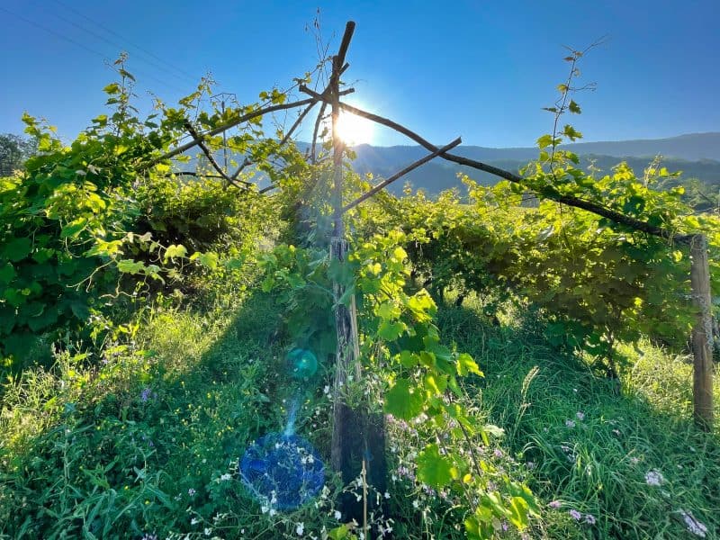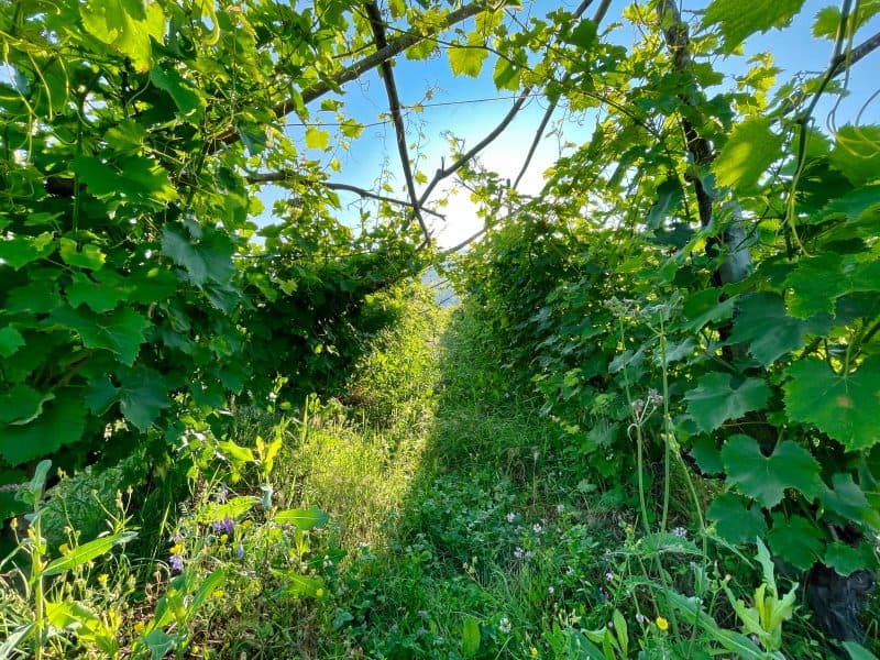 Standing in Curtet’s vineyards, it’s a little hard not to feel a sense of joy and delight, perhaps not unlike watching a group of very young children at play with their imaginations and nothing more than the random items they find around them. The vines and their surrounding vegetation are bursting with life and simply doing what they do, blissfully growing as best they know how. Not being particularly given to mystical, metaphysical, or spiritual expressions, I nonetheless can’t deny the vibrant energy evidenced by the riot of green life on display.
