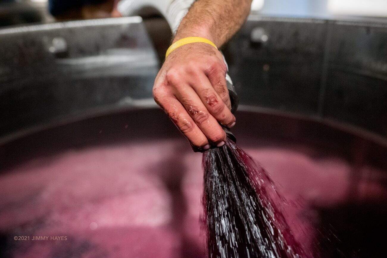 A Cabernet pumpover proceeds at Covert Estate in the Coombsville AVA of Napa Valley. The French term is remontage, which makes the process of pumping fresh juice from the bottom of the tank over the layer of skins and pulp floating at the top of the tank sound glamorous. Pumpovers introduce some oxygen to the wine, while allowing carbon dioxide to escape, as well as helping to extract the important color, flavor and aroma compounds from the skins of the grapes.
