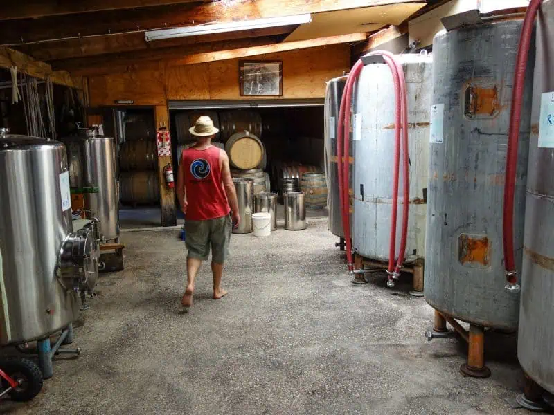 Mills makes his wines in a relatively compact, modest cellar that honestly isn’t much more than a shack. Separate blocks of the vineyard are picked and fermented separately. Each fermenter or batch of wine is given a name starting with a sequential letter of the alphabet, and then each barrel of wine from that fermenter gets a corresponding unique name, often a play on words. When I visited, the “Easter” fermenter had spawned barrels named “Bunny” and “Island” while the Jack fermenter begat “O Lantern” and “Knife.”