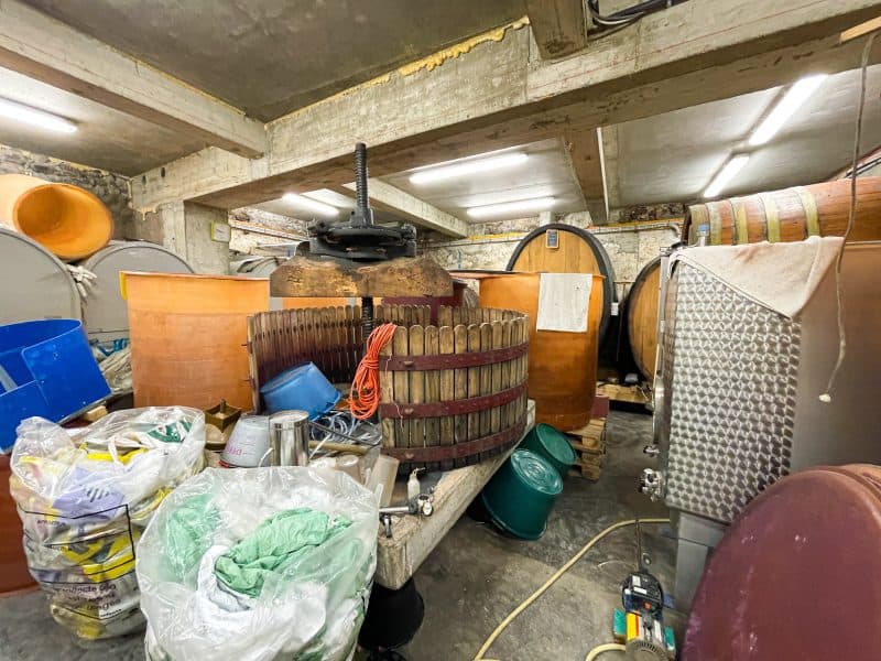 Goury works in a pretty traditional way in both his vineyards and cellar, farming organically (with forays into biodynamics), hand harvesting, destemming his red grapes, and using rather antiquated processing equipment, including the ancient basket press you see above that he inherited from his grandfather.