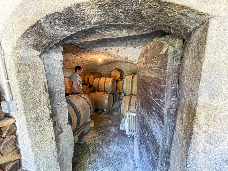 One of Goury’s wines, the “Le Berillion” Mondeuse, ages for 2 years on the fine lees and then another six years in the bottle before being made available for sale. He’s currently selling the 2015 vintage of that wine, which comes from an exceptionally steep (50% slope) hillside planted in 1966 that locals refer to as the slope of death, or “coteaux de la mort.”