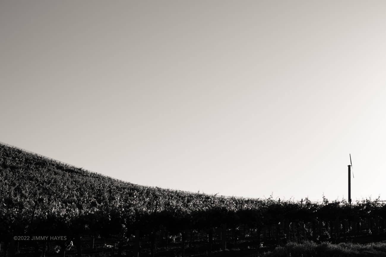 The slope of a vineyard curves smoothly against the sky towards a low point occupied by a frost fan at Kistler Vineyard in the mountains above Sonoma Valley. Frost fans keep the cold air from pooling in the lowest points of a vineyard which can lead to damaging freezes.