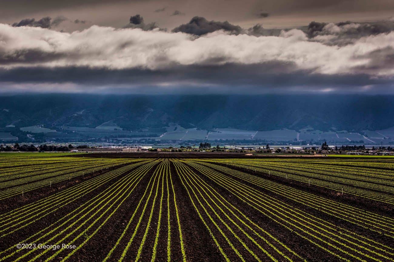 Fog hangs heavy across the Salinas Valley, just above the tops of the vineyards of the Santa Lucia Highlands, which rise up the alluvial hillsides of the Santa Lucia Mountains. Today, amidst yet another wave of rainfall, the Salinas River is expected to potentially burst its banks, temporarily turning the entire Monterey Peninsula into an island.
