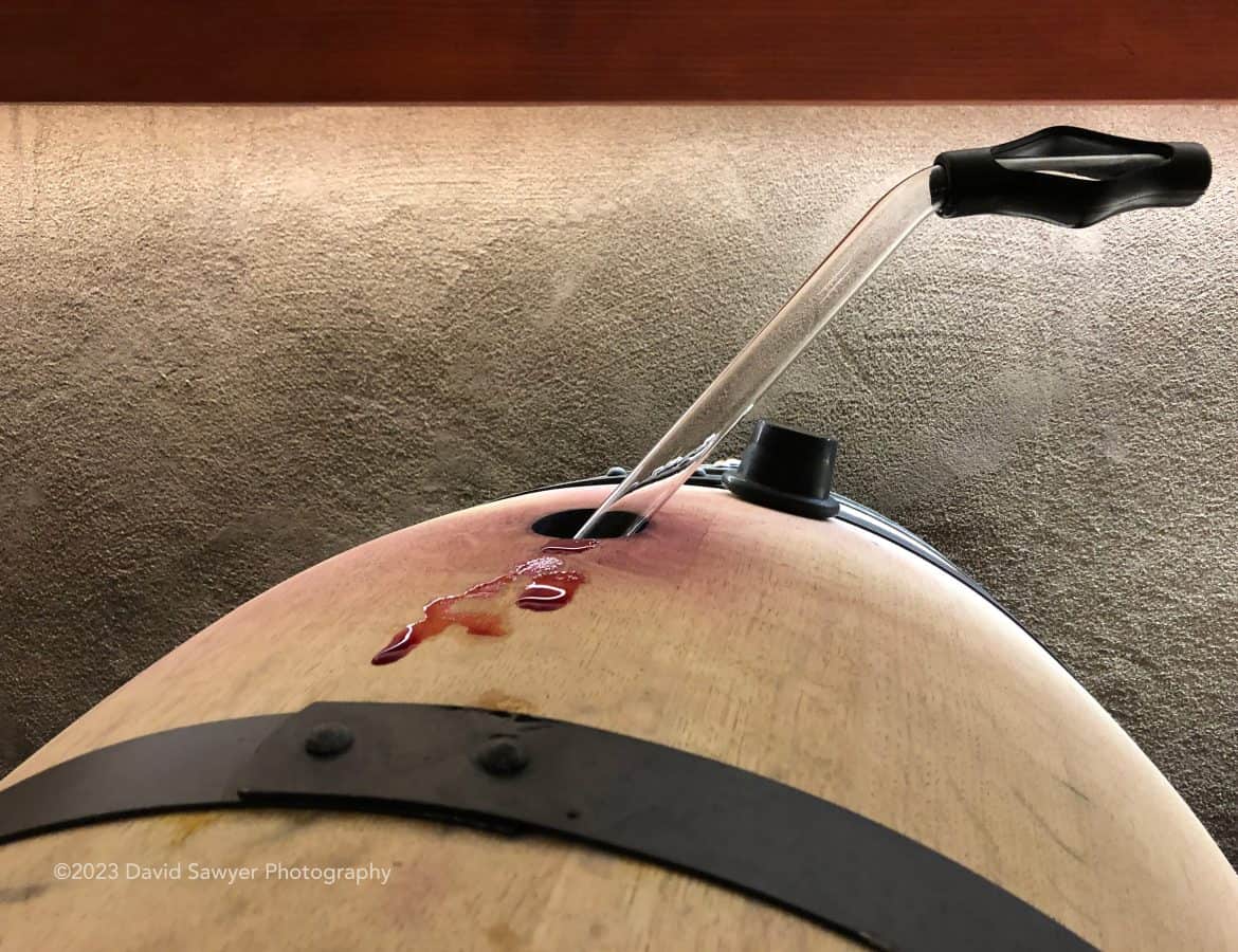 Caught in the act. A ‘wine thief’ used to take barrel samples rests in an open bung hole at Anomaly Vineyards in the St. Helena appellation of Napa Valley. Winemakers regularly sample wines from barrel to check their evolution and determine whether the wine requires any maintenance as proceeds towards the point of bottling.