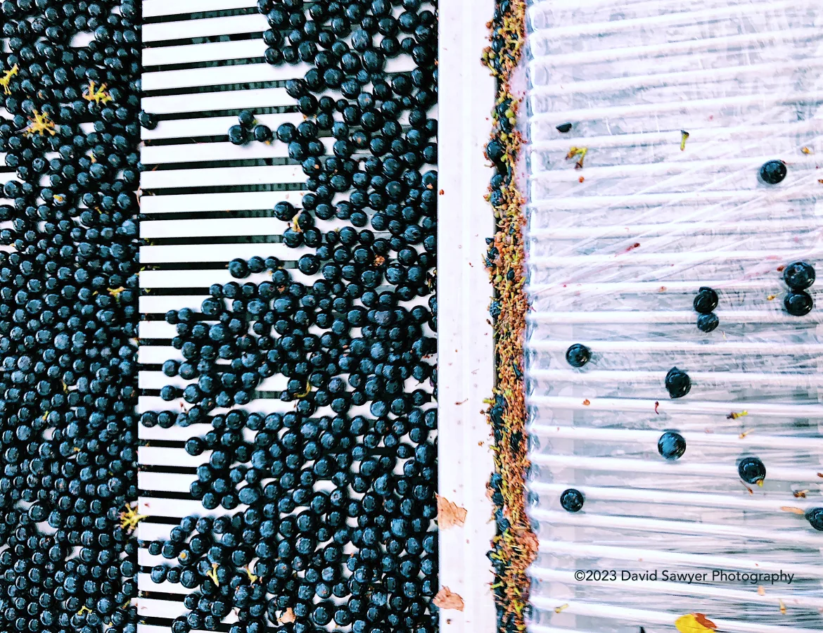 Shiny berries of Cabernet Sauvignon and just a few stem jacks are all that is left after the vibrating sorting table does its work at Anomaly Vineyards in St. Helena, California. Sorting tables are a key piece of equipment for many quality-conscious wineries in California, helping to reduce the dreaded MOG (material other than grapes) as well as helping to eliminate dried or otherwise imperfect grapes from the fermentation.