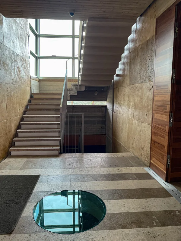 Windows open in the cellar automatically when the temperature reaches 22˚ C / 71˚ F. The warm air escaping the windows draws in air from pipes in the floor that extend down the hill and open out onto the green fields below the winery. As air passes through these pipes buried deep in the earth, it cools and emerges in the cellar to passively regulate the temperature.