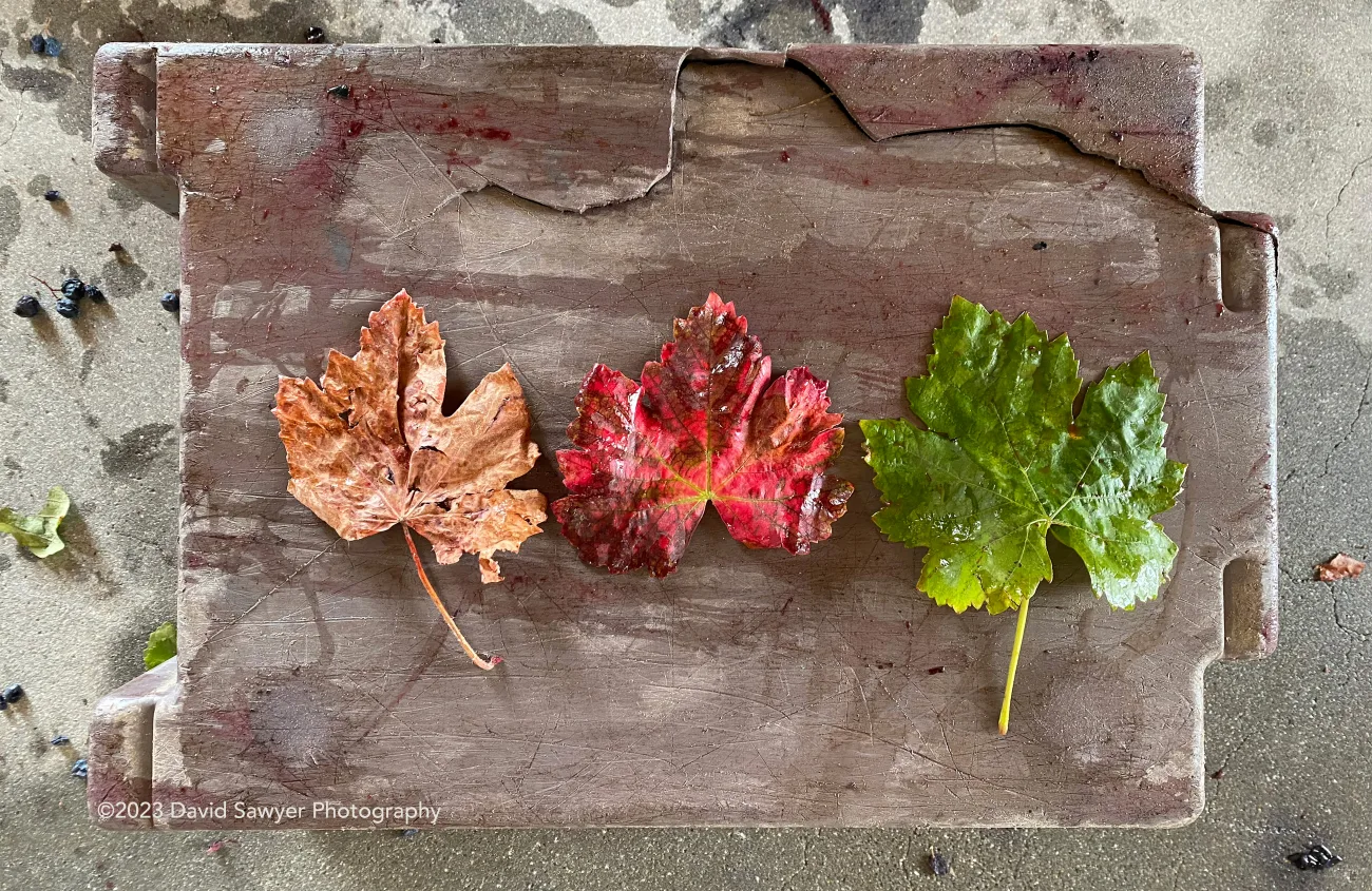 Three leaves showing the progression and beauty of a vine from the start to the end of harvest in Portugal’s Alentejo region. Once harvest is complete, temperatures drop, sunlight wanes, and the vines begin to move into their winter dormancy, protecting themselves and conserving energy to weather the winter to come.