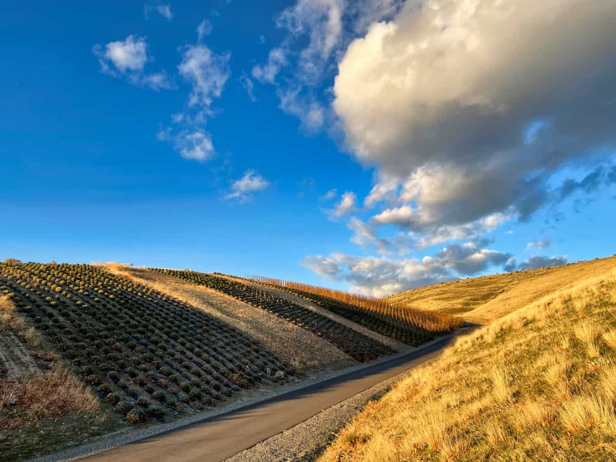 Winemakers around the Northern Hemisphere are on a heightened state of alert when it comes to the weather as harvest begins or approaches. Rain, excessive heat, frost, and increasingly fire can all threaten a year’s meticulous work. Over the next 8 weeks, for instance, the vast majority of fruit will be harvested in California. Speaking of eyeing the weather, here’s a view of WeatherEye vineyard in Washington’s Red Mountain AVA, showing the main road that rises to the top of the vineyard site, planted with vines as well as lavender and other Mediterranean herbs.