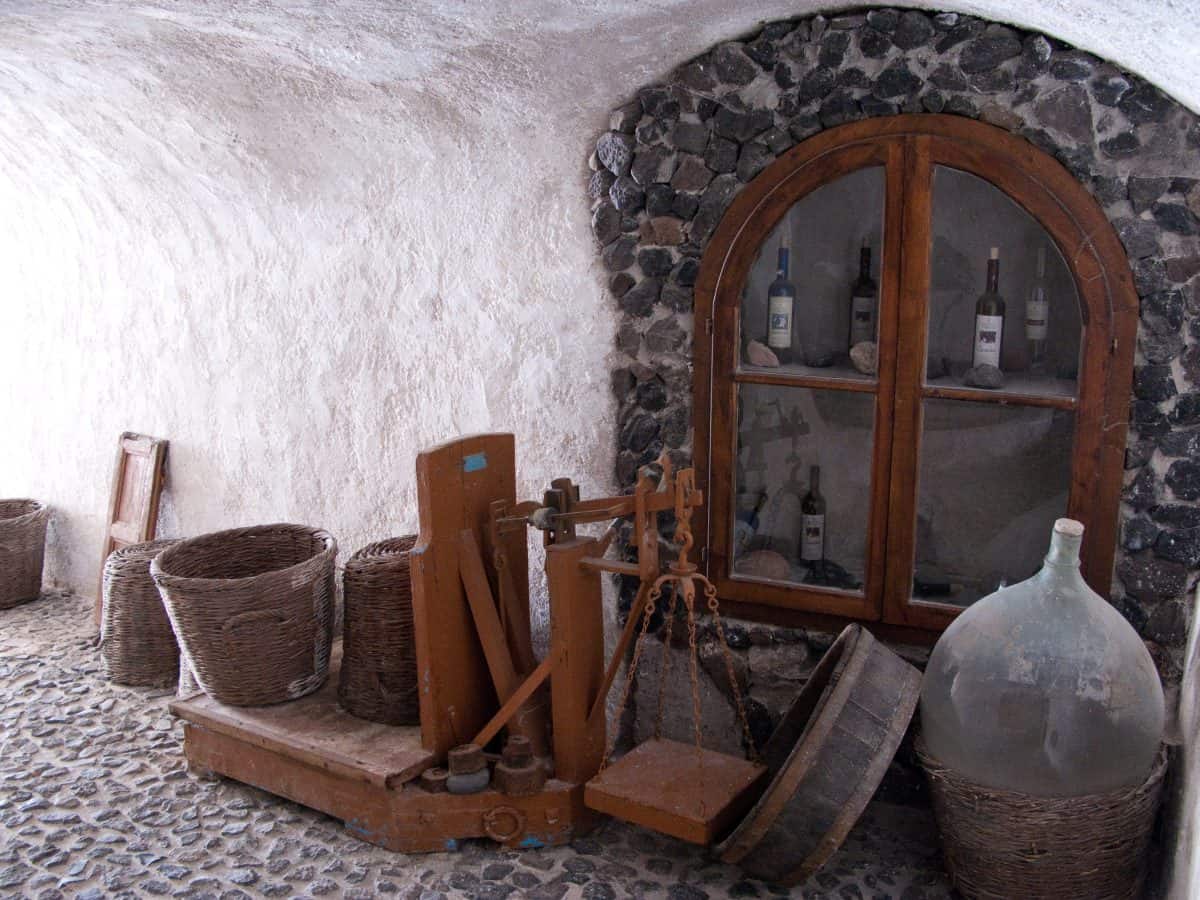In a small corner of the Gavalas winery in Santorini, visitors can find the tools of the winemaking trade from around the turn of the century. Wine was often made in the large glass balloons known as demijohns, and grapes were weighed in their wicker baskets on an ancient scale. Old vintages of Gavelas wine can be seen in the cabinet set into the stone wall.