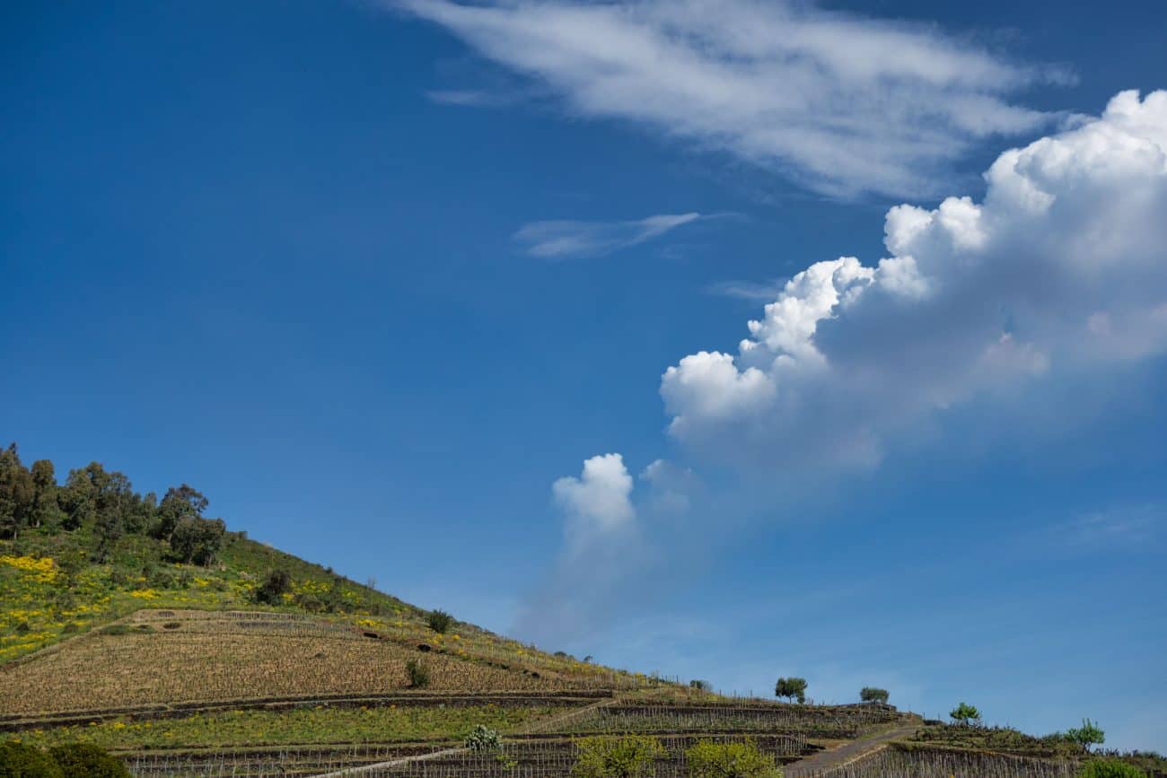 That’s no cloud! The volcanic plume from Mount Etna emerges just over the shoulder of a hill filled with vineyards on the southern slopes of the volcano. I believe these to be (my memory is a little fuzzy) some of the vineyards of Benanti, just outside their winery near Trecastagni, Sicily.