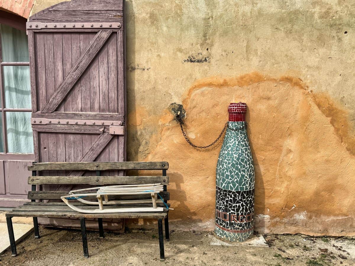 Citizen Kane would have felt very much at home in the driveway of Domaine Lapierre in the Fleurie appellation of Beaujolais. Not that people get to go sledding all that much in Beaujolais. The mosaic-clad wine bottle (secured by a chain lest you think you might walk off with the 50kg object) is a better indication of what people like to do in the dark of winter around those parts.