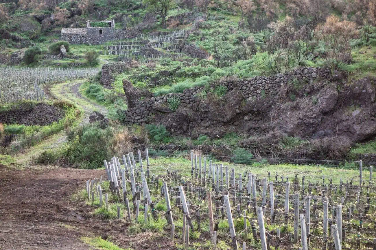 Vineyards on Mount Etna in Sicily are only possible where the lava flows have eroded and decomposed enough for there to be a bit of soil in between the piles of stones that make up old flows. Here a road winds between vineyard plantings, old and new stone walls, and the raw outcroppings of cooled lava that characterize the very special terroir of the region.