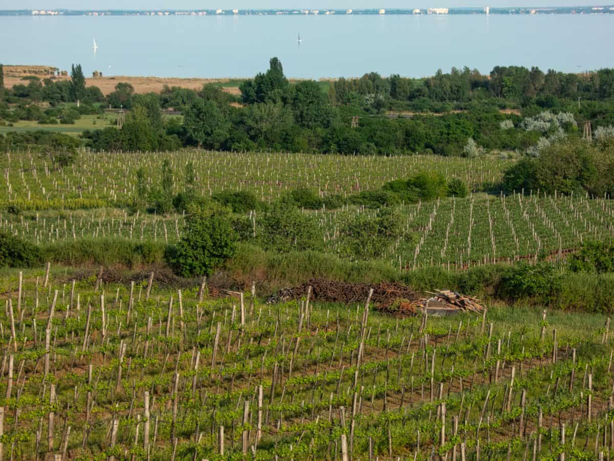 When it comes to viticulture, water shapes possibility. Large bodies of water can often make winegrowing possible where it might otherwise not be possible. Though that is not entirely the case with Lake Balaton in eastern Hungary, the lake plays a major role in the regional climate, moderating frost potential and lengthening the growing season. Some people even believe that reflected sunlight from the lake can add warmth to its surrounding vineyards like these.