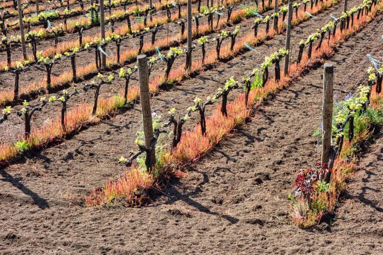 Spring growth underneath vines on Mount Etna in Sicily catches the sunlight and echoes the fire that created the landscape itself. The red plants are likely sheep sorrel (Rumex acetosella), which grows in the spring in the acidic, powdery basalt and ash soils of Etna. This planting is relatively young, and departs from the traditional albarello (bush vine) training that characterizes the oldest and most impressive vineyards on Etna.