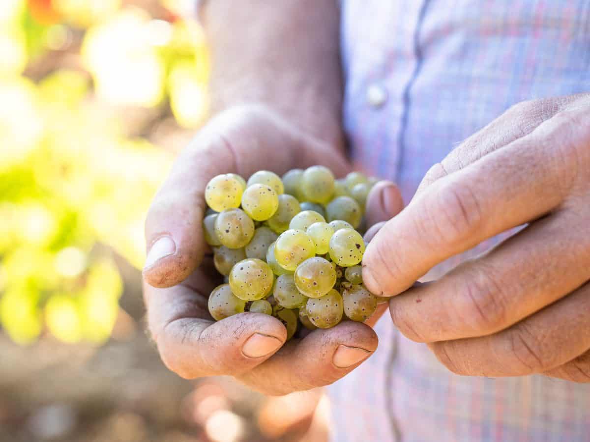 Image of Riesling grapes in the hands of Mike Lucia, owner of Cole Ranch Vineyards by Leigh-Ann Beverley.